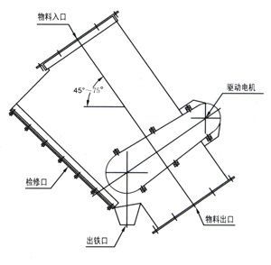 由管道體、驅(qū)動(dòng)裝置、磁體運(yùn)行裝置三大部分組成,驅(qū)動(dòng)裝置安裝在管道壁上,通過鏈輪、鏈條帶動(dòng)管道體內(nèi)磁分離腔的磁體運(yùn)行裝置運(yùn)轉(zhuǎn),永磁體將管道內(nèi)物料中混雜的鐵磁性物質(zhì)通過出鐵口排出管道外。